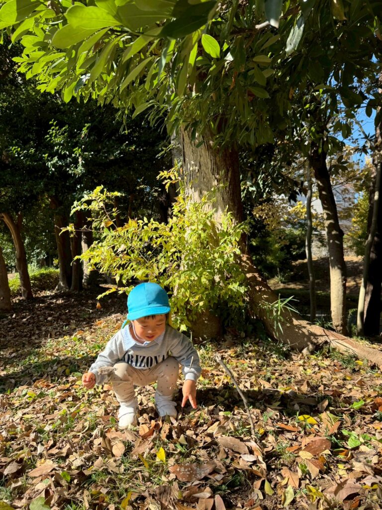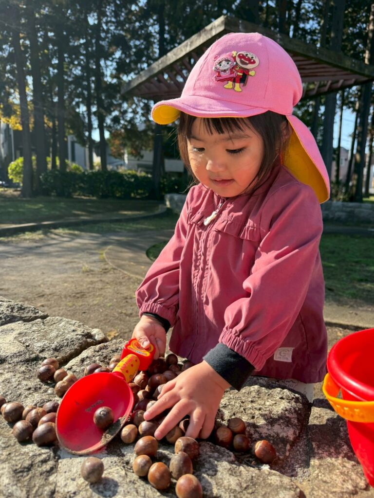 子どもたちは夢中でどんぐりを拾いバッグにたくさん集めたり、風が吹くたびに