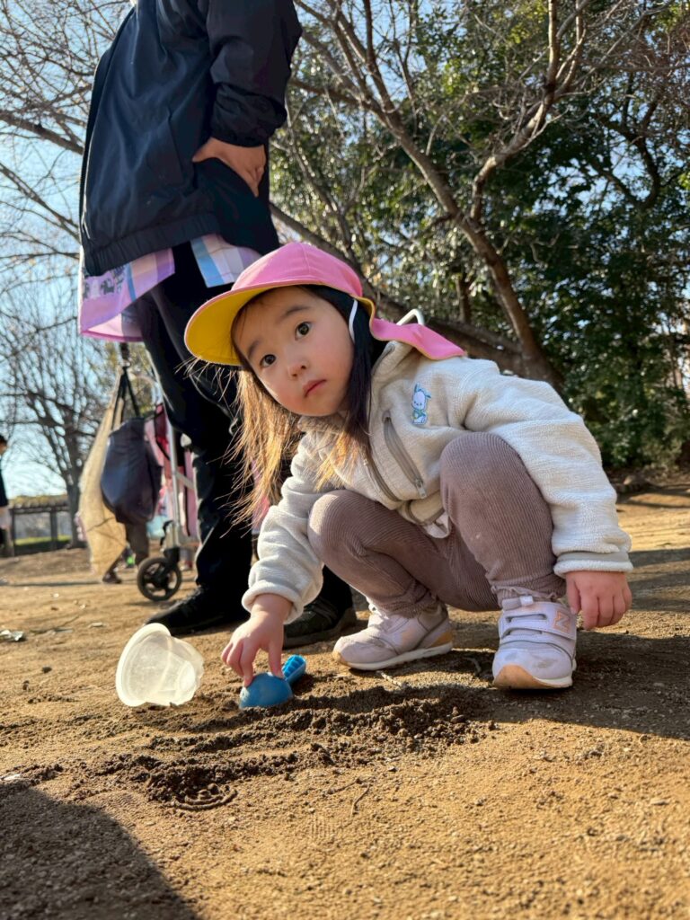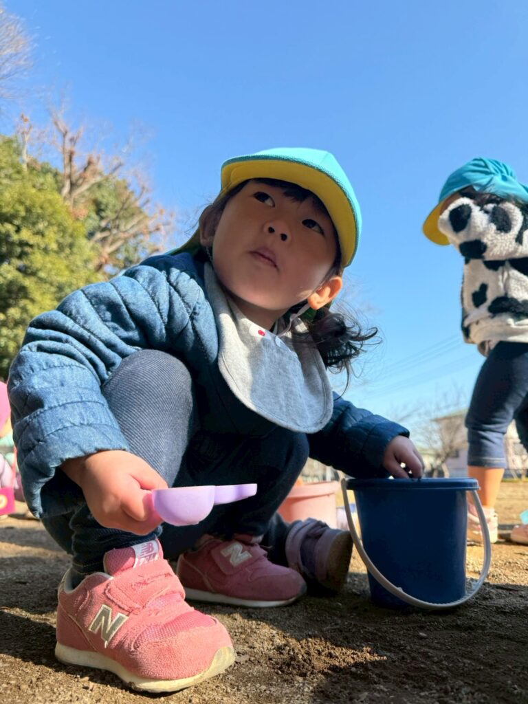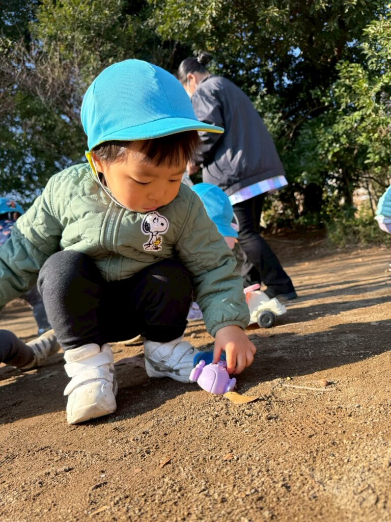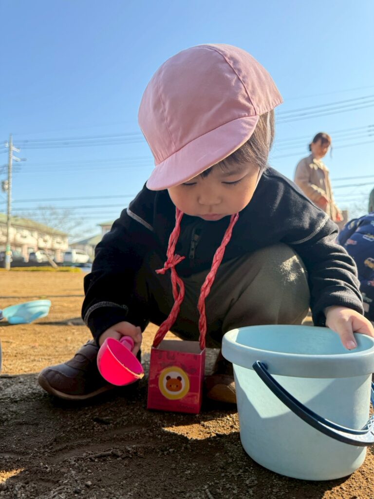 スコップを使って砂をすくったり、落ち葉を手に取って音や感触を楽しむ子どもたち。